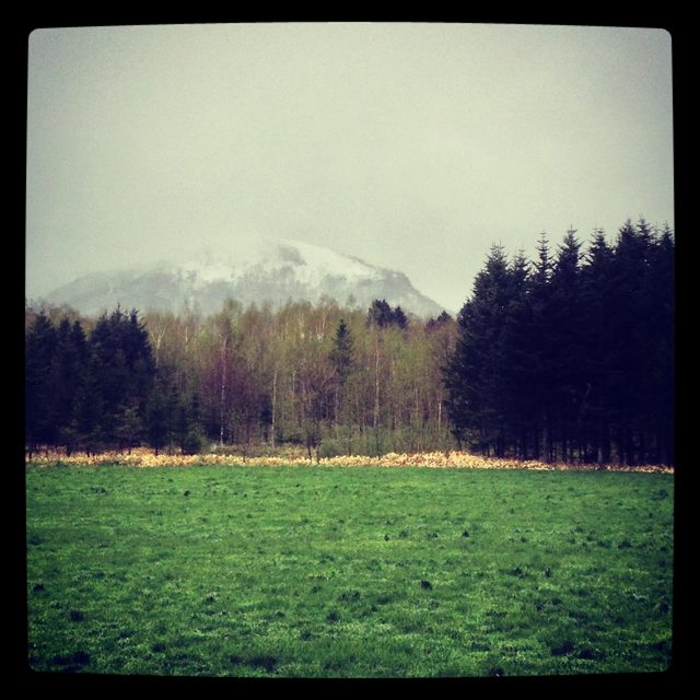 昨日の夜に山間部で雪が降ったらしい。オブタツ山が冠雪していた。ビラオ山も白いらしい。